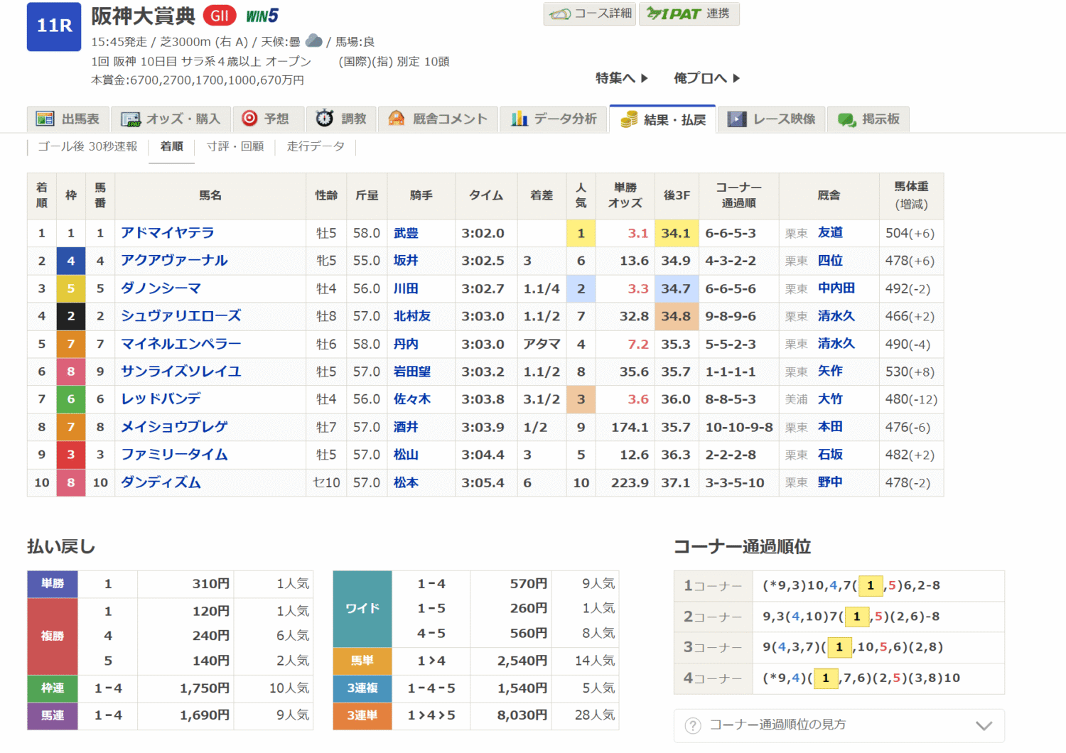 HOME > 競馬結果 > 【競馬結果】2026年 阪神大賞典 GⅡ 2026年3月22日 スポンサーリンク 昨日の記事です。 【競馬予想】2026年 阪神大賞典 GⅡ■芝3000mはスタミナ勝負!展開と有力馬を徹底考察 ■長距離戦のポイントは「ペースと体力配分」 芝3000mという長距離レースは、一般的な中距離戦とはまったく別物といえる。まず感じるのは「とにかく長 ... こちら結果です。 前回の記事では、アドマイヤテラ+武豊騎手は強いと書きましたが、1着を取りました。オッズも3.1だったので単勝賭けてもよさそうでしたね。 本命のアクアヴァーナルも、よかったです。4,5着で追走しつつ最後に足を残していました。惜しいところで、こちらは単勝には届かなかったですが、複勝でも2.4倍ついているので、美味しいところかなと。他のオッズ高い馬は、やはりなかなか厳しい戦いだったと思います。3000mで体力温存+最後の脚を残せるかが大切なのかなと。 ▼競馬論を学べるnote販売中▼ 何かが見えてきそうな手の届くような、そんな競馬論 スポンサーリンク Twitter Share Pocket Hatena LINE -競馬結果