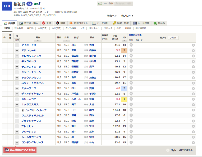 桜花賞(G1) 出馬表 | 2026年4月12日 阪神11R レース情報(JRA) - netkeiba