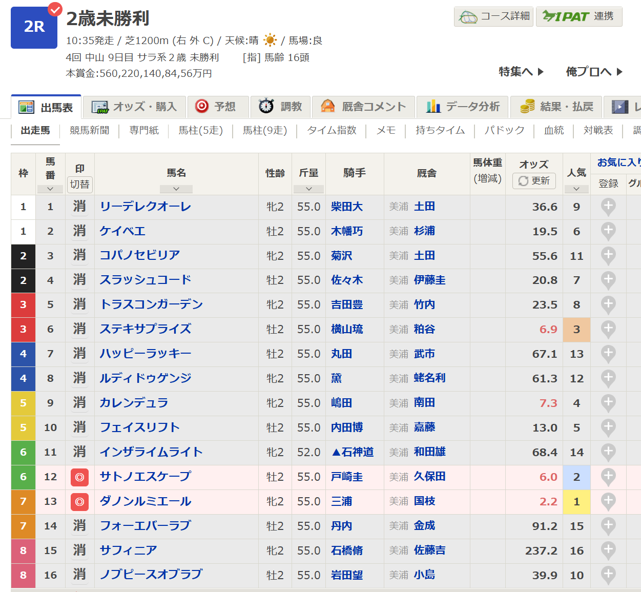 4回 中山 9日目 サラ系2歳 未勝利 [指] 馬齢 16頭
